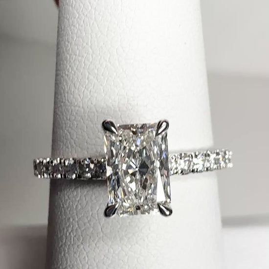 This is a lovely pre-loved lab-grown fancy cut diamond engagement ring in solid 14k white gold. It will come with a digital (and photo print out) report of the center stone, which has a laser engraved number on the girdle that corresponds with the report.