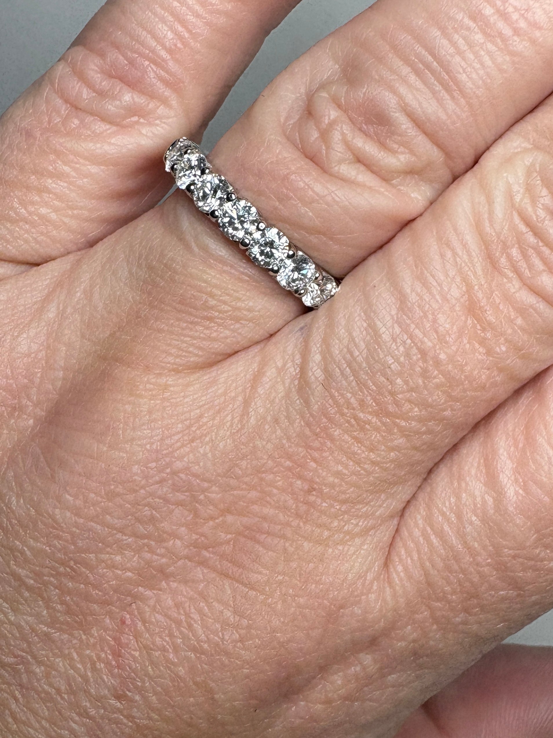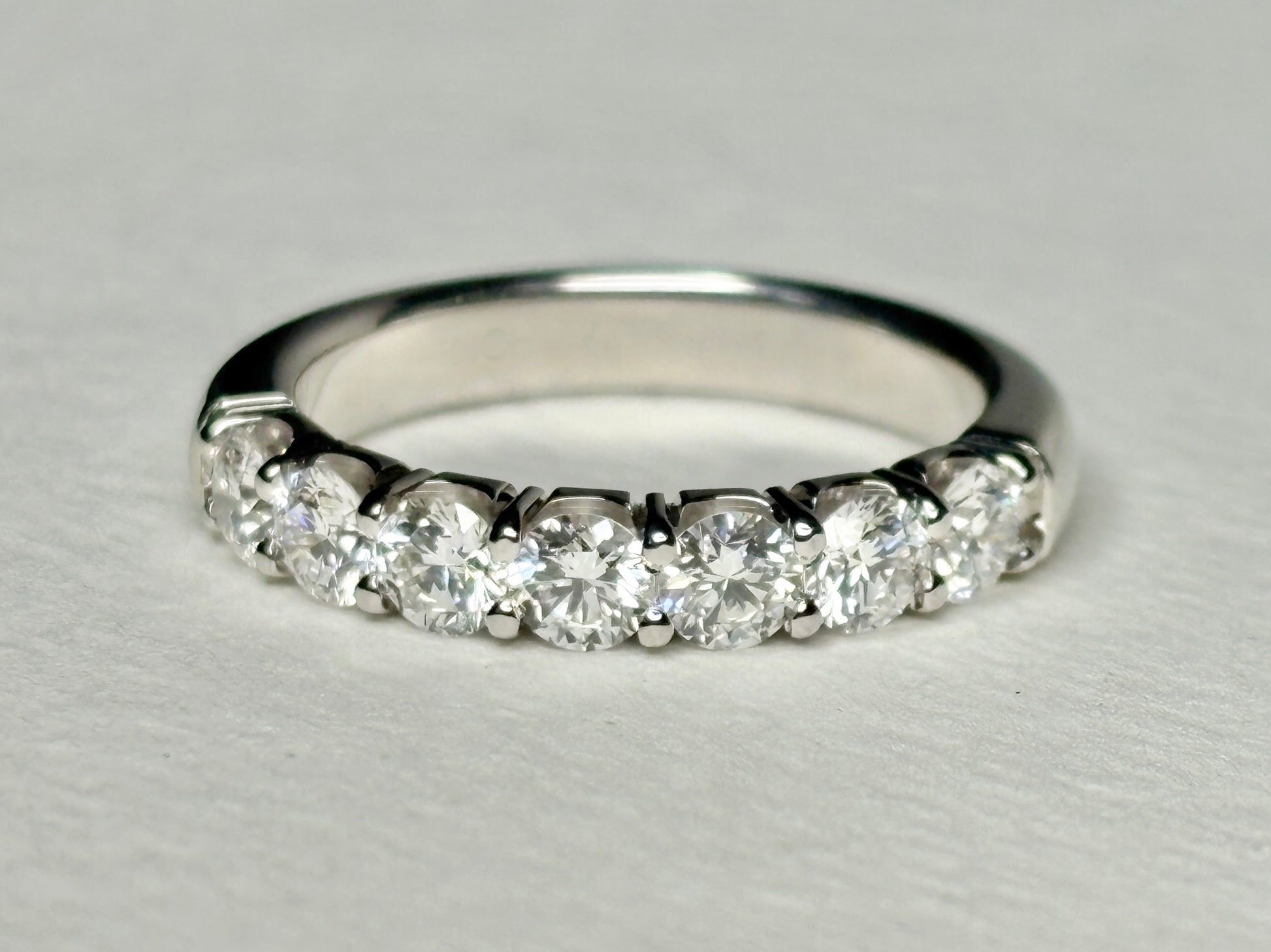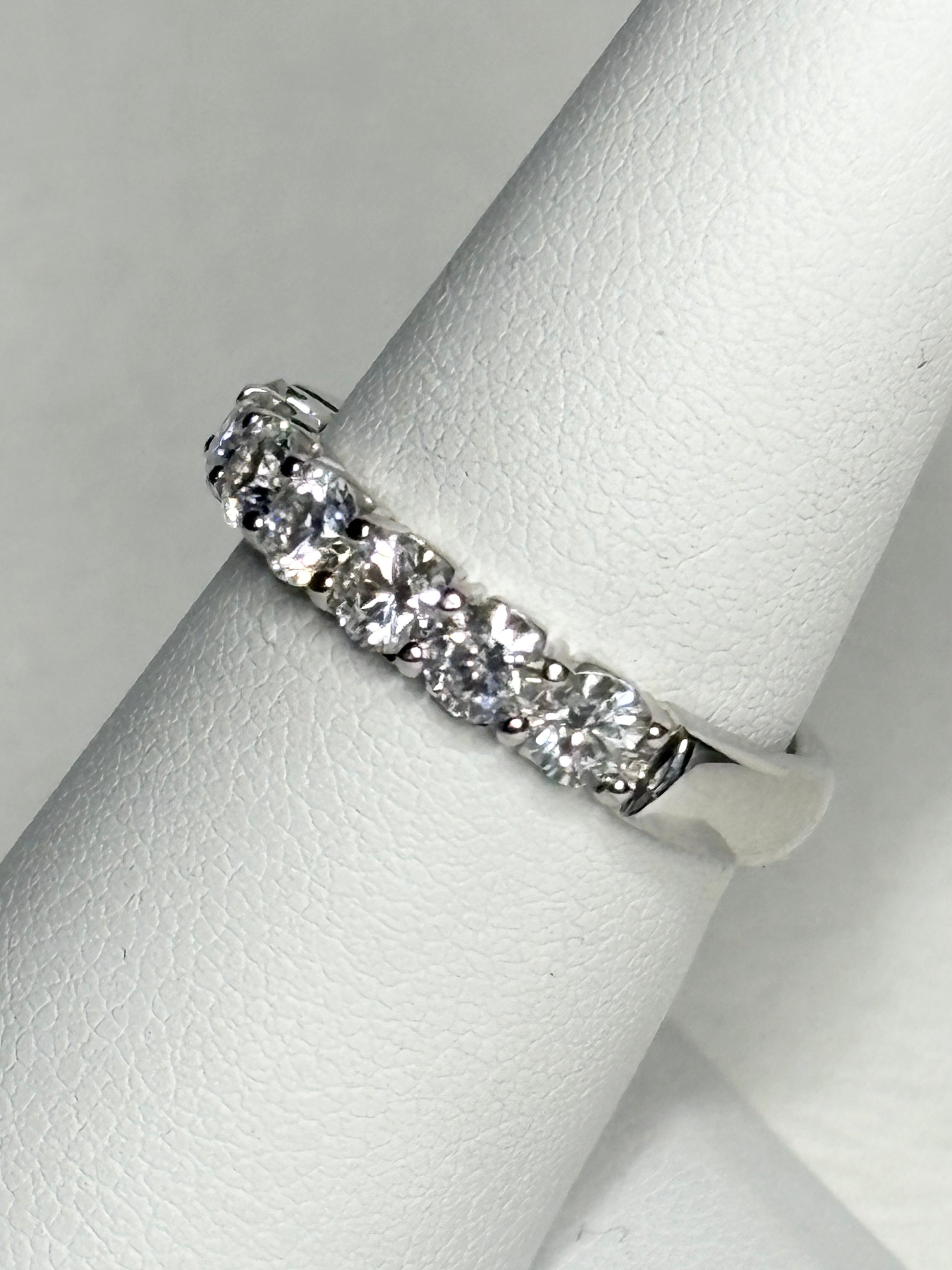 This is a pre-loved anniversary style band ring featuring 7 natural well faceted diamonds; each roughly .17 each for a total approximate carat weight of 1.19ctw. The 3.5mm round diamonds are nice quality of VS2-SI/GH.