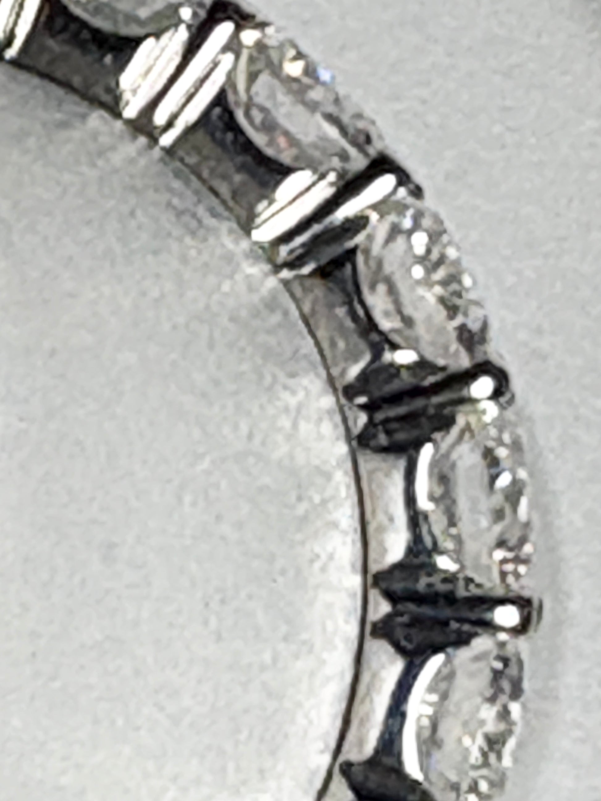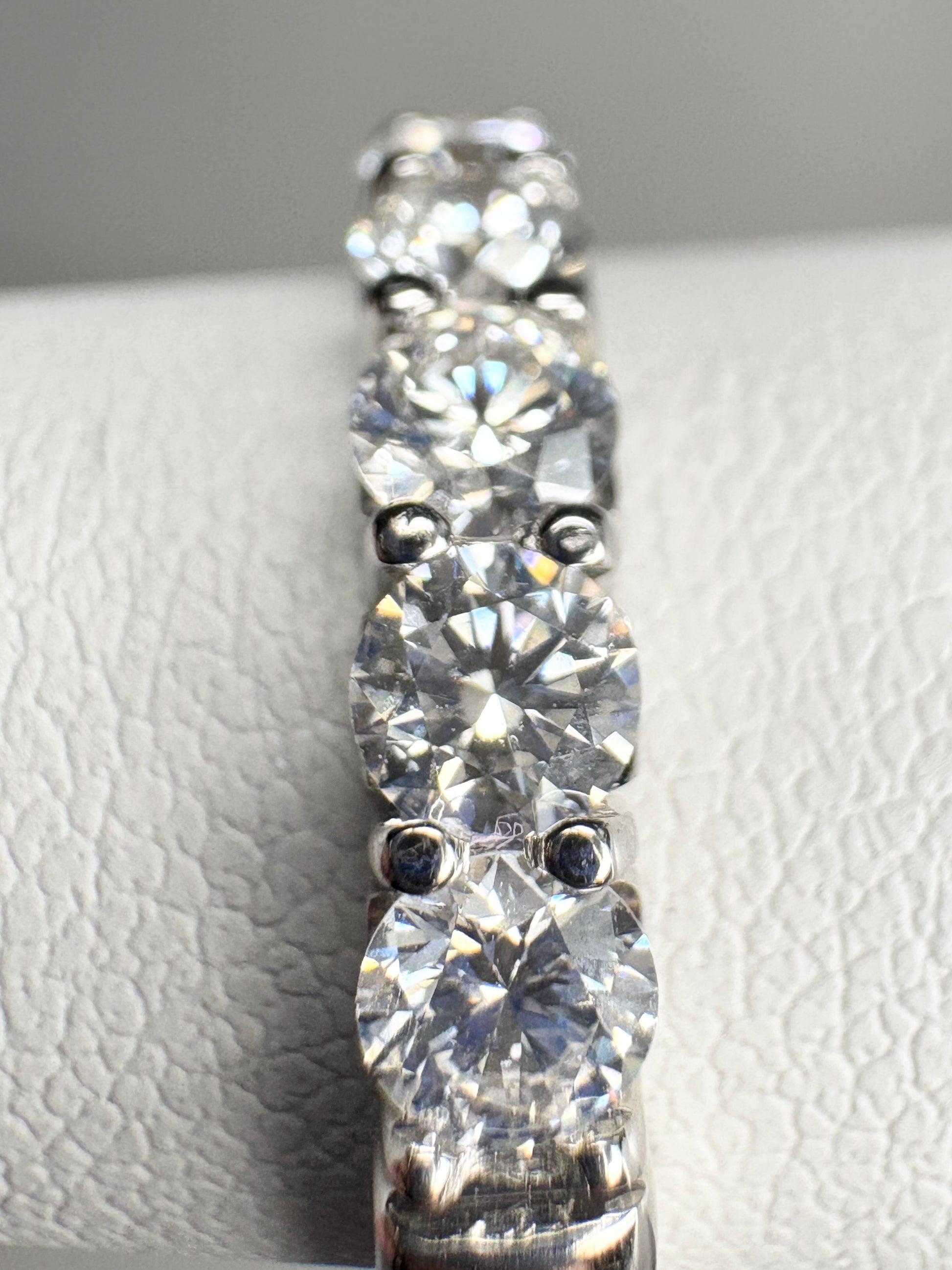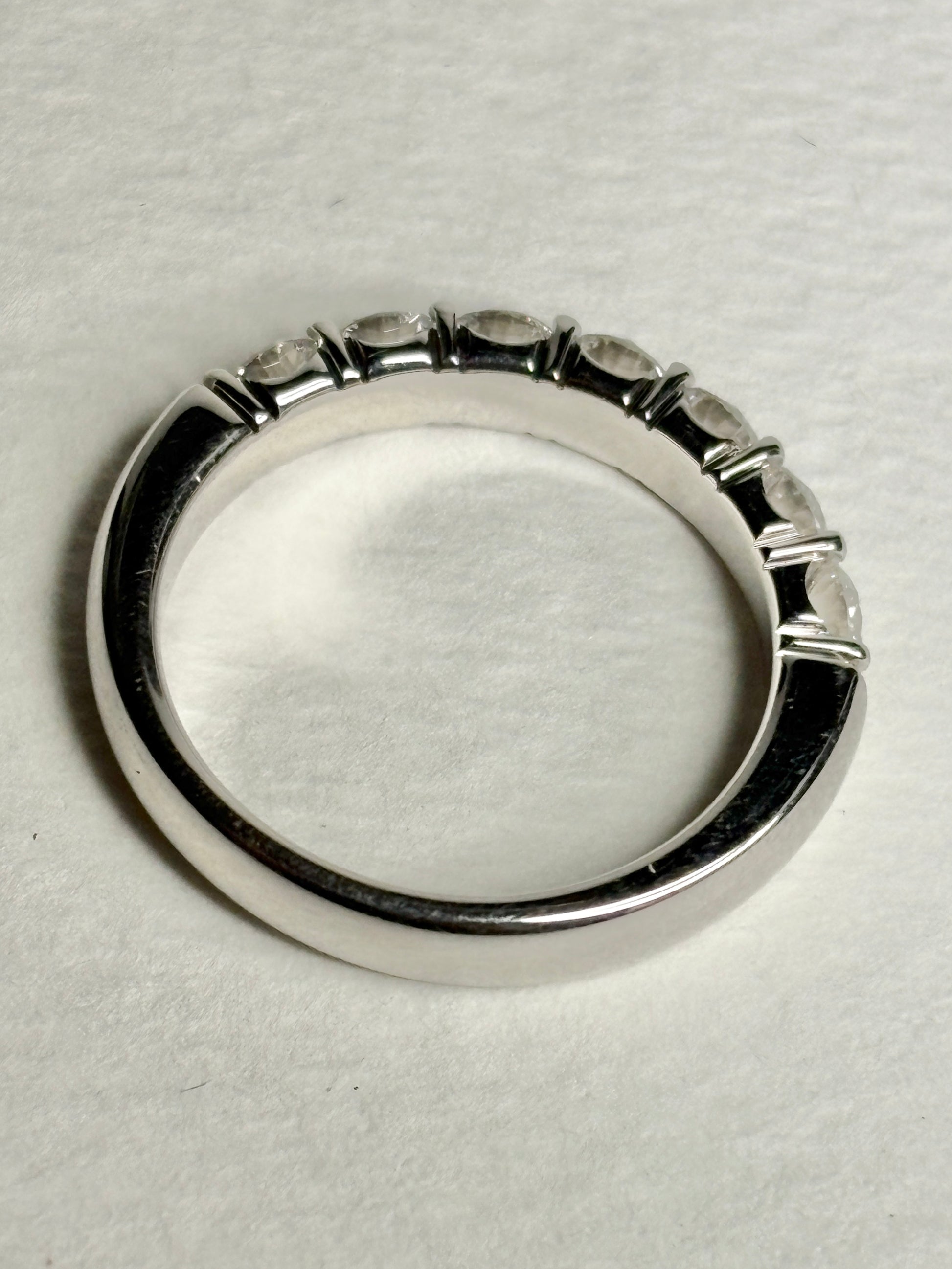 This is a pre-loved anniversary style band ring featuring 7 natural well faceted diamonds; each roughly .17 each for a total approximate carat weight of 1.19ctw. The 3.5mm round diamonds are nice quality of VS2-SI/GH.