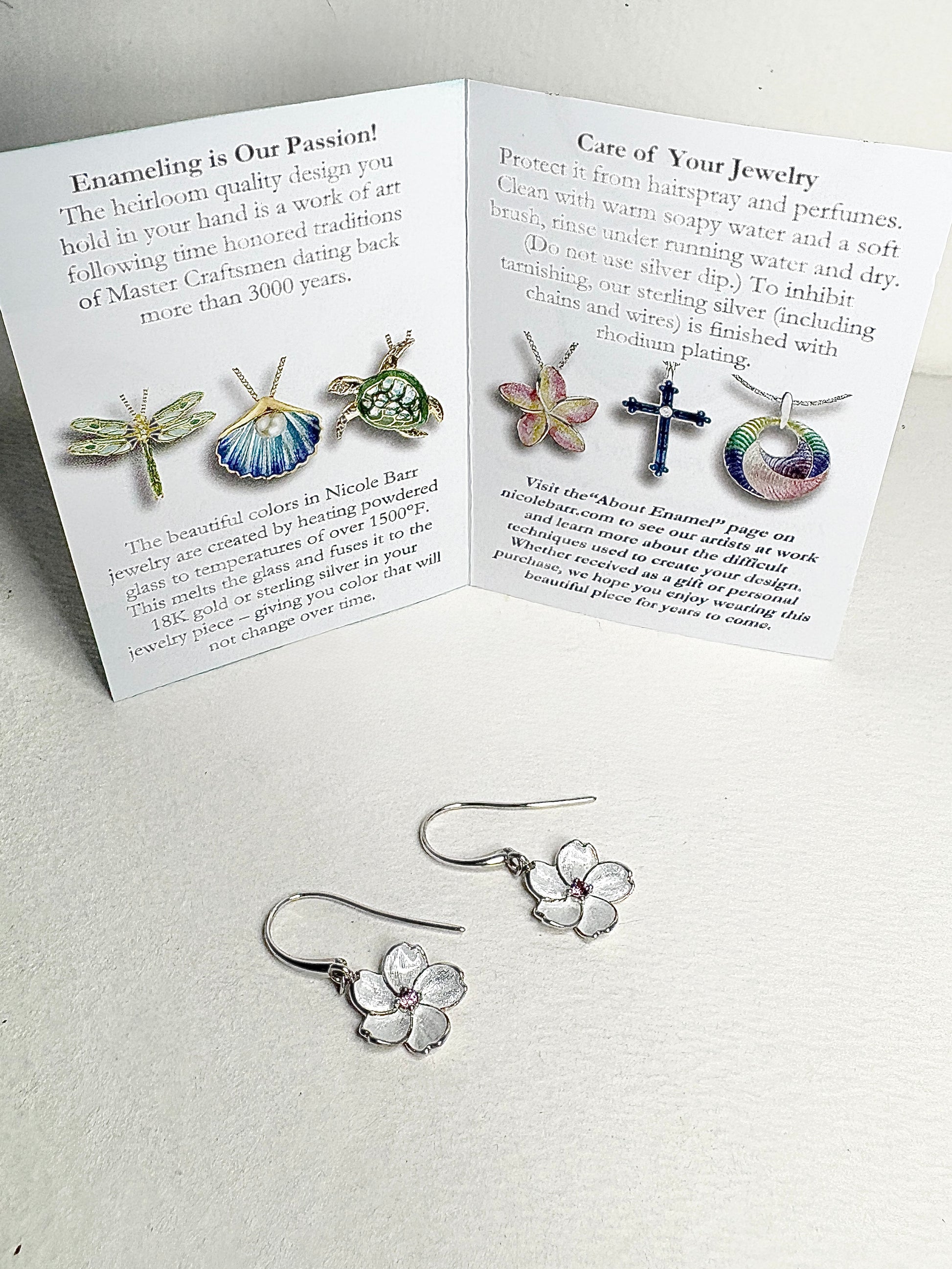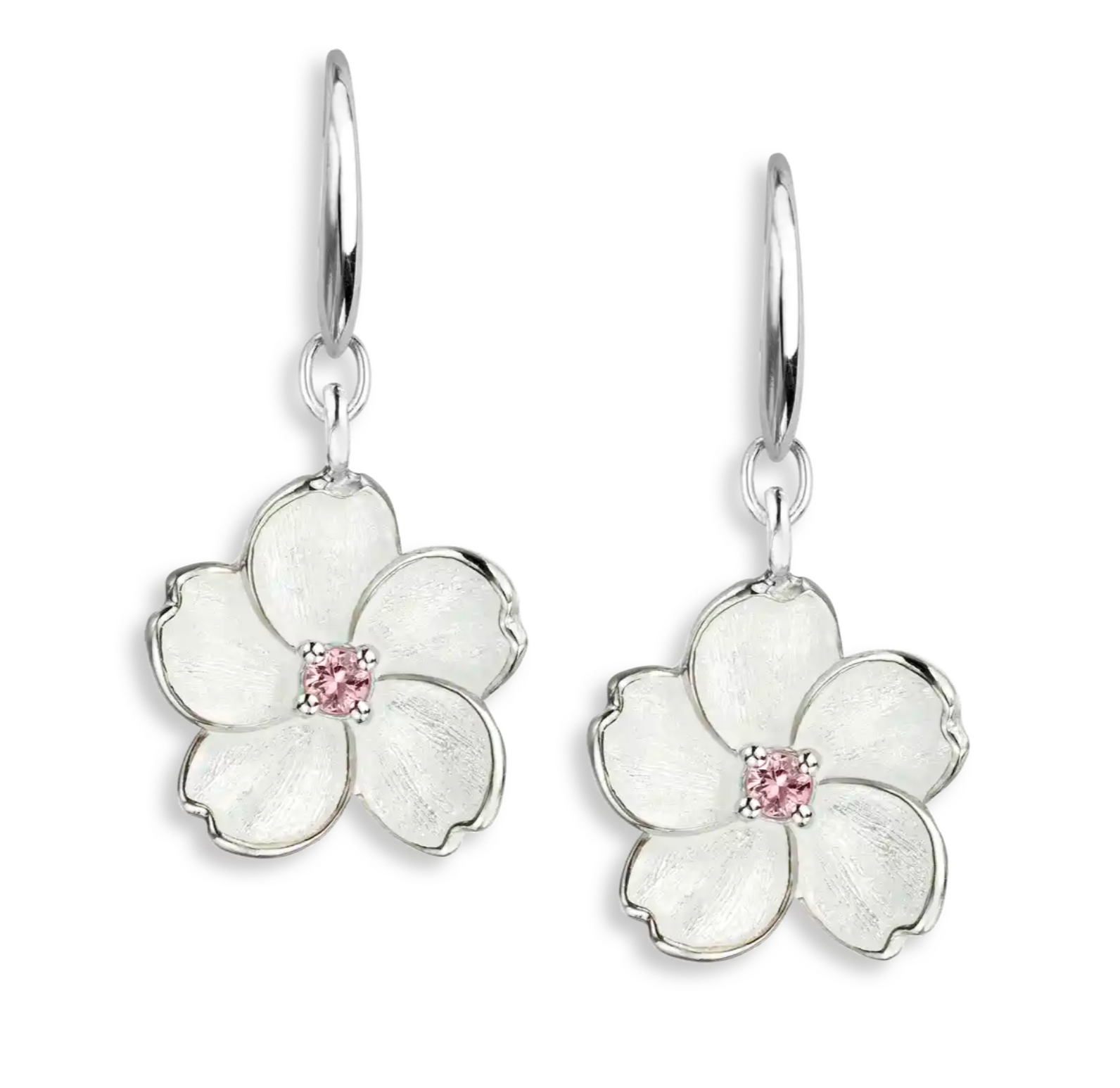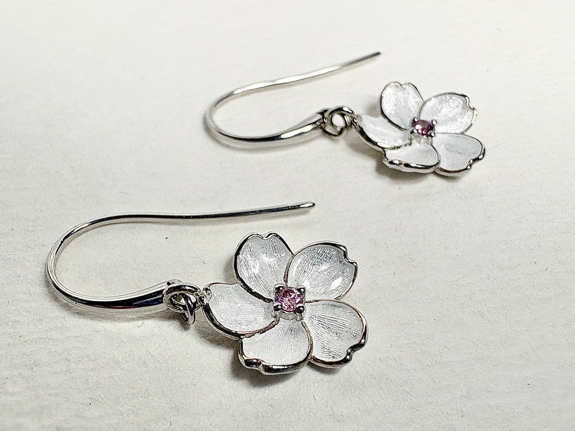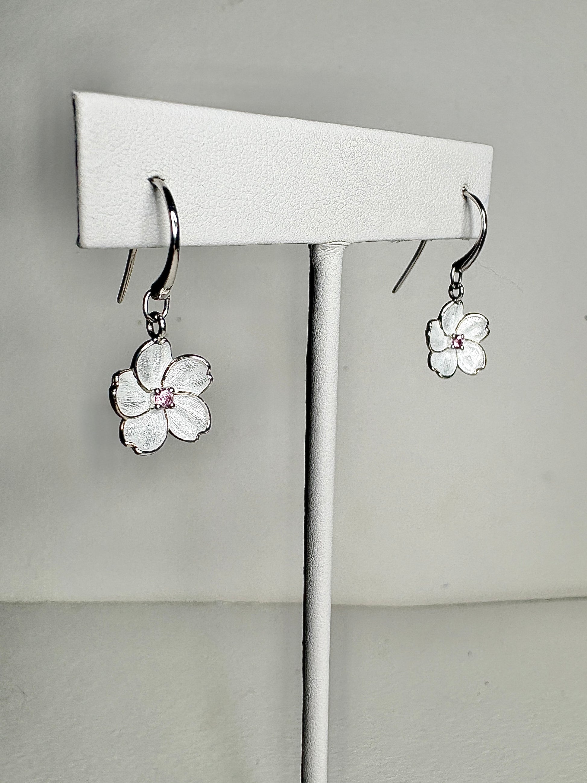 White Cherry Blossom Wire Earrings. Sterling Silver-Pink Sapphire